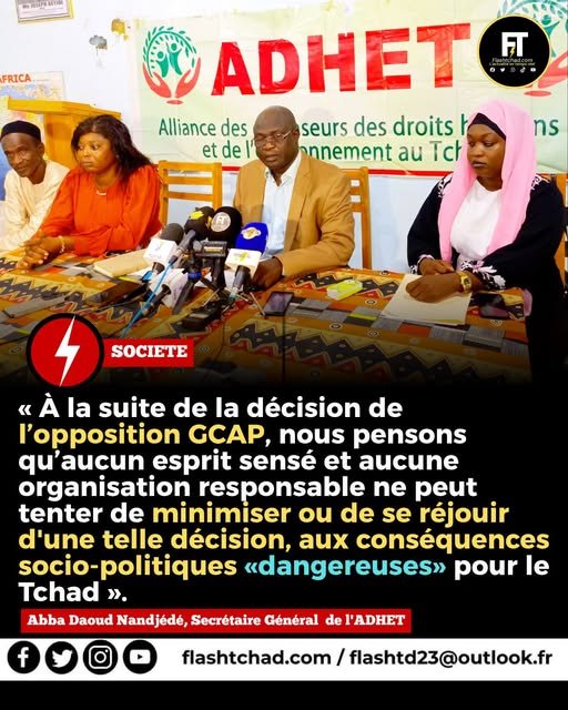#Tchad🇹🇩| l'ADHET invite le gouvernement et le GCAP au dialogue. Par un point de presse animé ce 25 octobre 2025, le Secrétaire Général de l’Alliance des Défenseurs des Droits Humains et de l’Environnement (ADHET) Abba Daoud Nandjédé appelle le Groupe de Concertation des Acteurs Politiques (GCAP) et le Gouvernement au dialogue. Selon lui, durant la campagne des élections passées, depuis le référendum aux législatives, locales sénatoriales en passant par les présidentielles, le GCAP a effectué une campagne de boycott actif sur presque l’ensemble du territoire national allant d’Abéché au sud du Tchad et différentes localités c'est, après l’invalidation de leur candidature à la présidentielle passée. Cette action active de terrain leur a permis de se rapprocher davantage des populations pour en gagner en notoriété et en sympathie. Lire l'intégralité de l'article ici ⤵️ https://flashtchad.com/tchad-ladhet-invite-le-gouvernement-et-le-gcap-au-dialogue/?fbclid=IwY2xjawO7T-picmlkETE2VHpTRGJlRWxuY3ZCenlrc3J0YwZhcHBfaWQQMjIyMDM5MTc4ODIwMDg5MgABHiUOq3eNP-LiJRohptJ_L8vx7IqLT6Y0KKYcqpJYNmhtgLtqRJSGAyTzeT1m&brid=8Rav5mdlyqP1MnZNyVdjIg #flashtchad #adhet