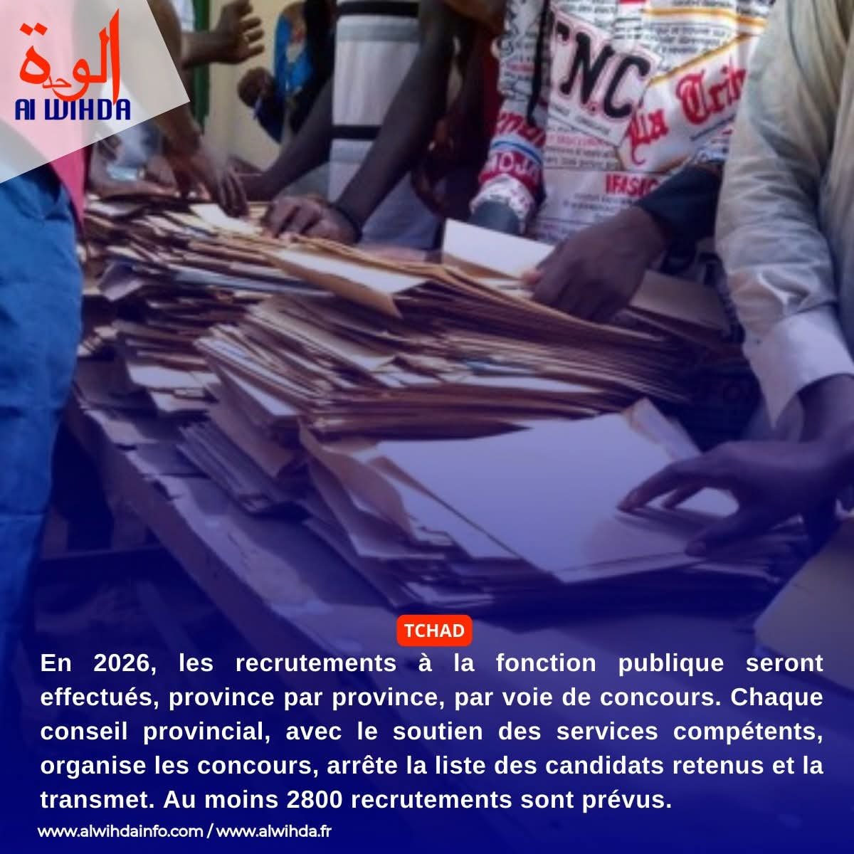#Tchad : En 2026, les recrutements à la fonction publique seront effectués, province par province, par voie de concours. Chaque conseil provincial, avec le soutien des services compétents, organise les concours, arrête la liste des candidats retenus et la transmet. Au moins 2800 recrutements sont prévus. 📌 Recrutements nationaux prévus : - 400 Instituteurs bacheliers ; - 400 Instituteurs adjoints ; - 300 Lauréats de l’Institut national de la jeunesse et des sports ; - 200 Agents du secteur de l’élevage (vétérinaires, ingénieurs techniques, agents techniques) ; - 100 Informaticiens développeurs. Total : 1 400 recrutements nationaux 📌 Recrutements complémentaires prévus dans les provinces : - 400 Instituteurs adjoints (anciens maîtres communautaires) ; - 500 Agents des eaux et forêts ; - 100 Infirmiers Diplômés d’État (IDE) ; - 110 Agents Techniques de Santé (ATS) ; - 100 Sages-femmes Diplômées d’État (SFDE) ; - 50 Pharmaciens ; - 50 Anesthésistes réanimateurs ; - 50 Laborantins (techniciens supérieurs) ; - 20 Radiologues ; - 20 Maintenanciers des équipements médicaux. Total provincial : 1 400 recrutements Il est également prévu des recrutements en remplacement numérique des fonctionnaires et des agents de l'État décédés ou admis à faire valoir leurs droits à la retraite, et des recrutements des agents ayant suivi la formation au sein des forces de sécurité et de défense.