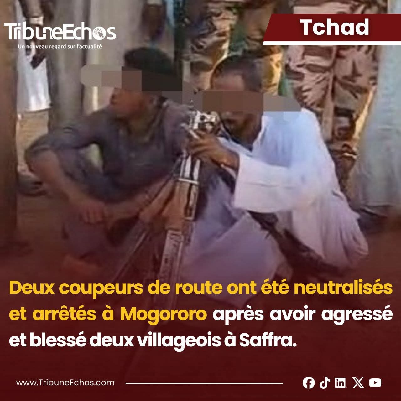 🇹🇩 #Sila : deux #coupeurs de route appréhendés par les forces de l’ordre à #Mogororo Les autorités du département d’Adé marquent un point dans la lutte contre l’insécurité. Un réseau de malfaiteurs opérant dans la zone vient d’être démantelé dans la sous-préfecture de Mogororo (Amdjirema), après une intervention des forces de défense et de sécurité. Les suspects sont accusés d’avoir agressé et blessé deux habitants du village de Saffra, situé à proximité de la sous-préfecture. Informé de la situation, le préfet du département d’Adé, Nassour Bichara Haggar, a immédiatement ordonné le déploiement d’une unité sur le terrain pour traquer les assaillants. L’opération, marquée par des échanges de tirs, s'est soldée par la neutralisation et l’arrestation des deux individus. Leurs armes ont également été saisies par les autorités. Pour l’administration locale, ce succès opérationnel illustre la vigilance constante des services de sécurité dans la protection des citoyens et de leurs biens. Dans une déclaration publique, le préfet Nassour Bichara Haggar a affirmé que les prévenus seraient traduits devant la justice pour répondre de leurs actes. Il a par ailleurs adressé une mise en garde ferme à quiconque tenterait de perturber la tranquillité publique, rappelant que la loi s’appliquerait avec rigueur. Enfin, le préfet a lancé un appel à la collaboration citoyenne, invitant la population à signaler tout comportement suspect aux forces de l’ordre. Cette synergie entre civils et militaires demeure, selon lui, le levier essentiel pour prévenir la criminalité et garantir la stabilité dans le département. #Tchad